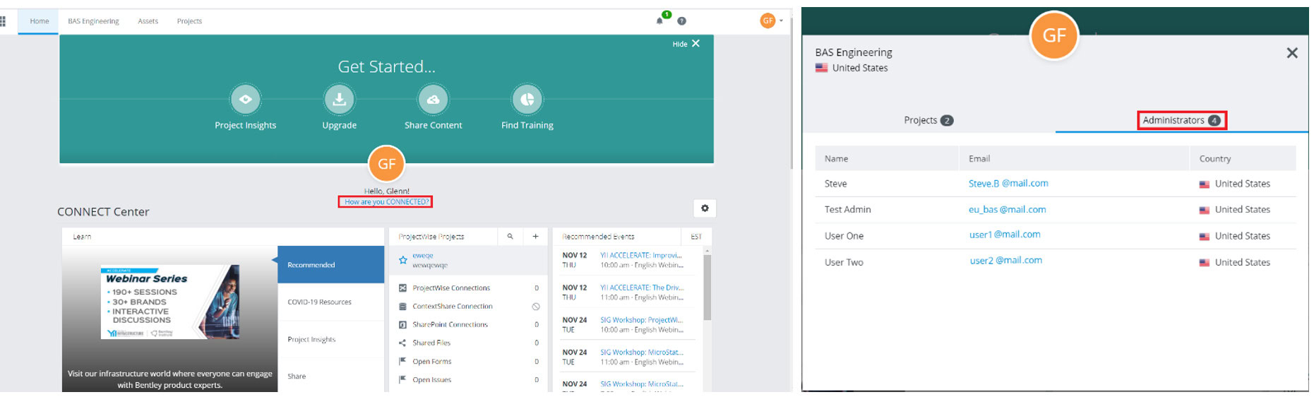 O CONNECT Center fornece informações sobre como um usuário é conectado. Com essa ferramenta, é possível ver a Associação de projetos e os Administradores dos projetos.