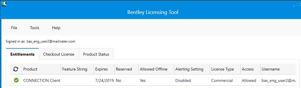 Abra a Bentley Licensing Tool para ver que ID de e-mail está conectado no momento e que tipo de licença, Practitioner ou Commercial, está em uso.