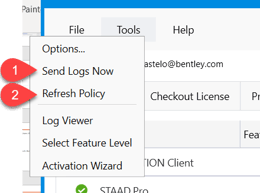 Se a sua Licença Profissional estiver atribuída corretamente, você poderá abrir a guia Tools na Bentley Licensing Tool e selecionar a opção Send Logs Now and Refresh Policy. Se isso não funcionar, entre em contato com a equipe especializada em satisfação dos usuários ou notifique-nos usando o recurso de Chat.